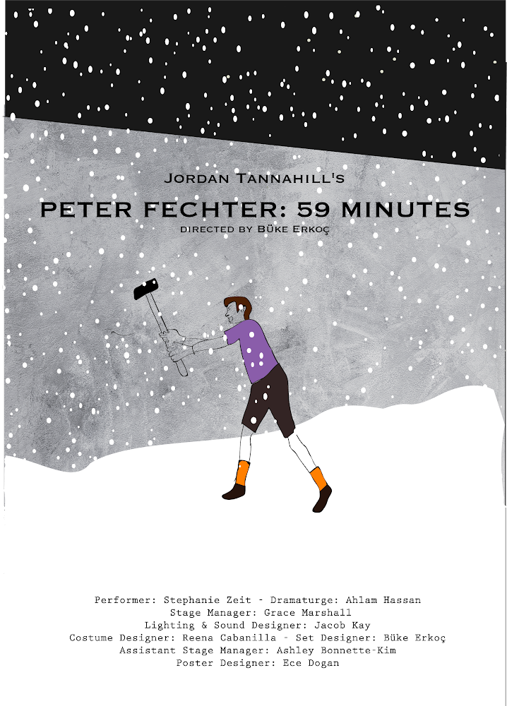Playwright: Jordan Tannahill Director: Büke Erkoç Performer: Stephanie Zeit Dramaturge: Ahlam Hassan Stage Manager: Grace Marshall Set Design: Büke Erkoç Lighting & Sound Design: Jacob Kay Costume Design: Reena Cabanilla Poster Design: Ece Doğan